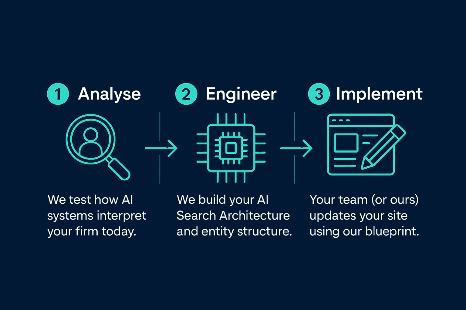 AI Search Engineering gives your business a complete AI Search Architecture, covering how your firm is defined, how your expertise is structured, how your trust signals appear across the web, and how AI systems interpret your services.